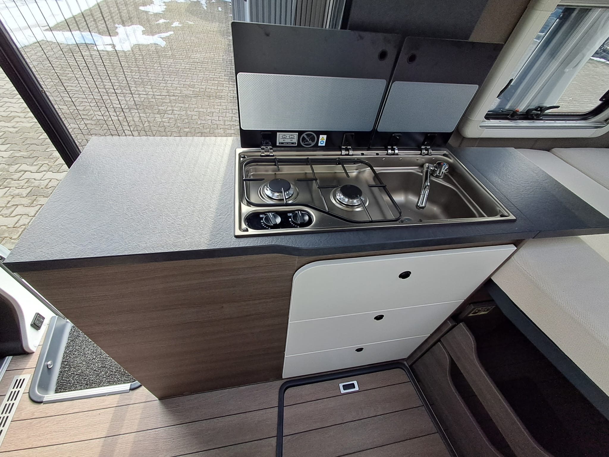 Kuchenka ze zlewozmywakiem, w tym kuchenka 2-palnikowa z elektrycznym zapłonem palnika i dzielonym – Dometic